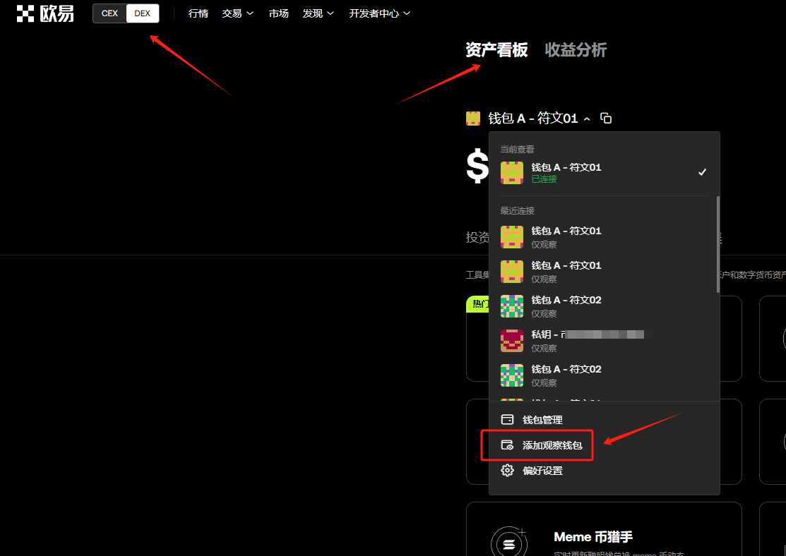 在okx的资产看板找到这个添加观察钱包,就可以看了